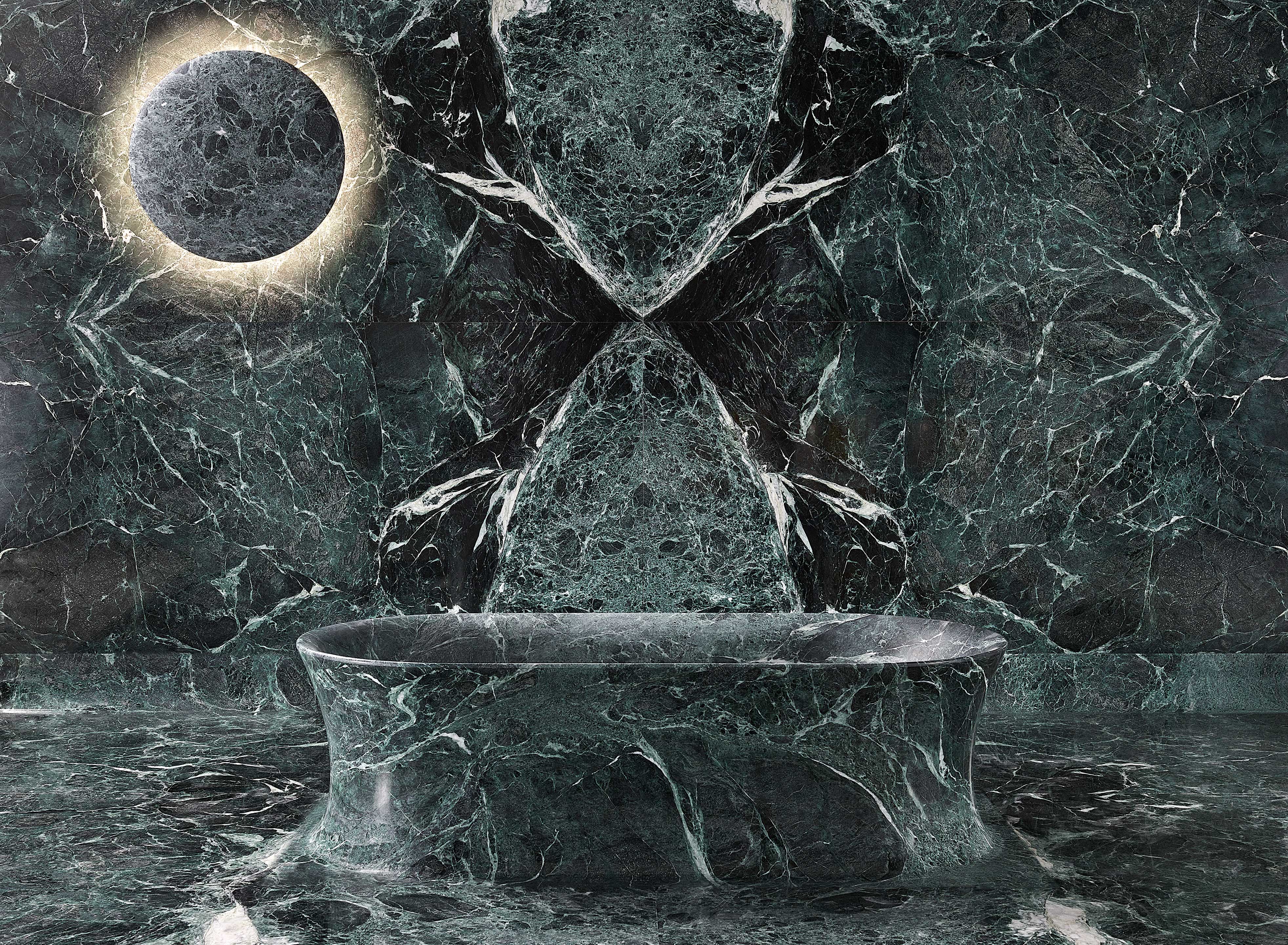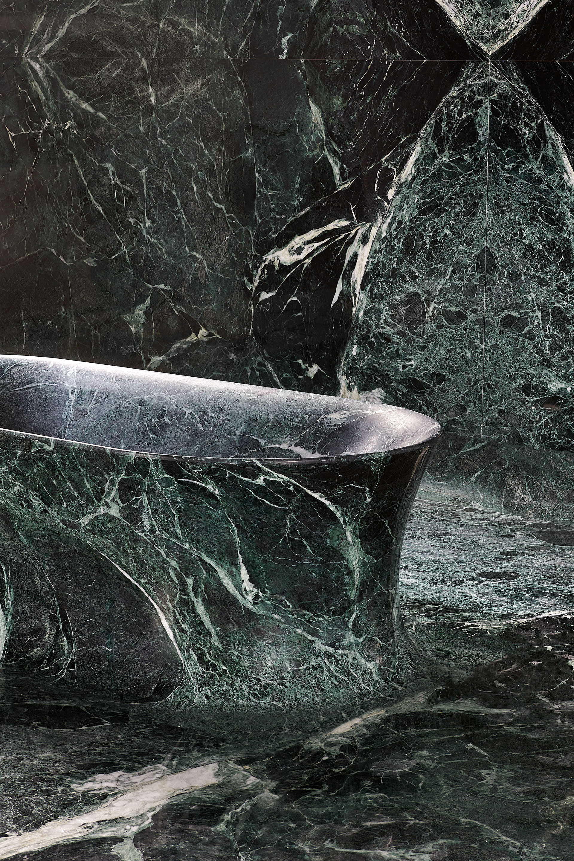 The material takes center stage here, presented in two contrasting finishes: the exterior is glossy and reflective, while the interior is matte and velvety. It is the water itself, with its primal force, that completes the design—filling the basin and creating a shifting reflection, a play of mirrors between nature and artifice.