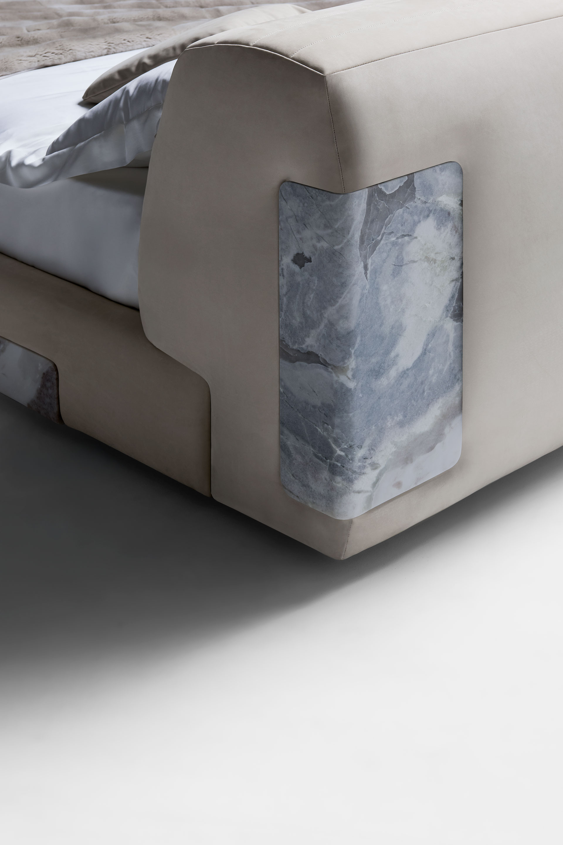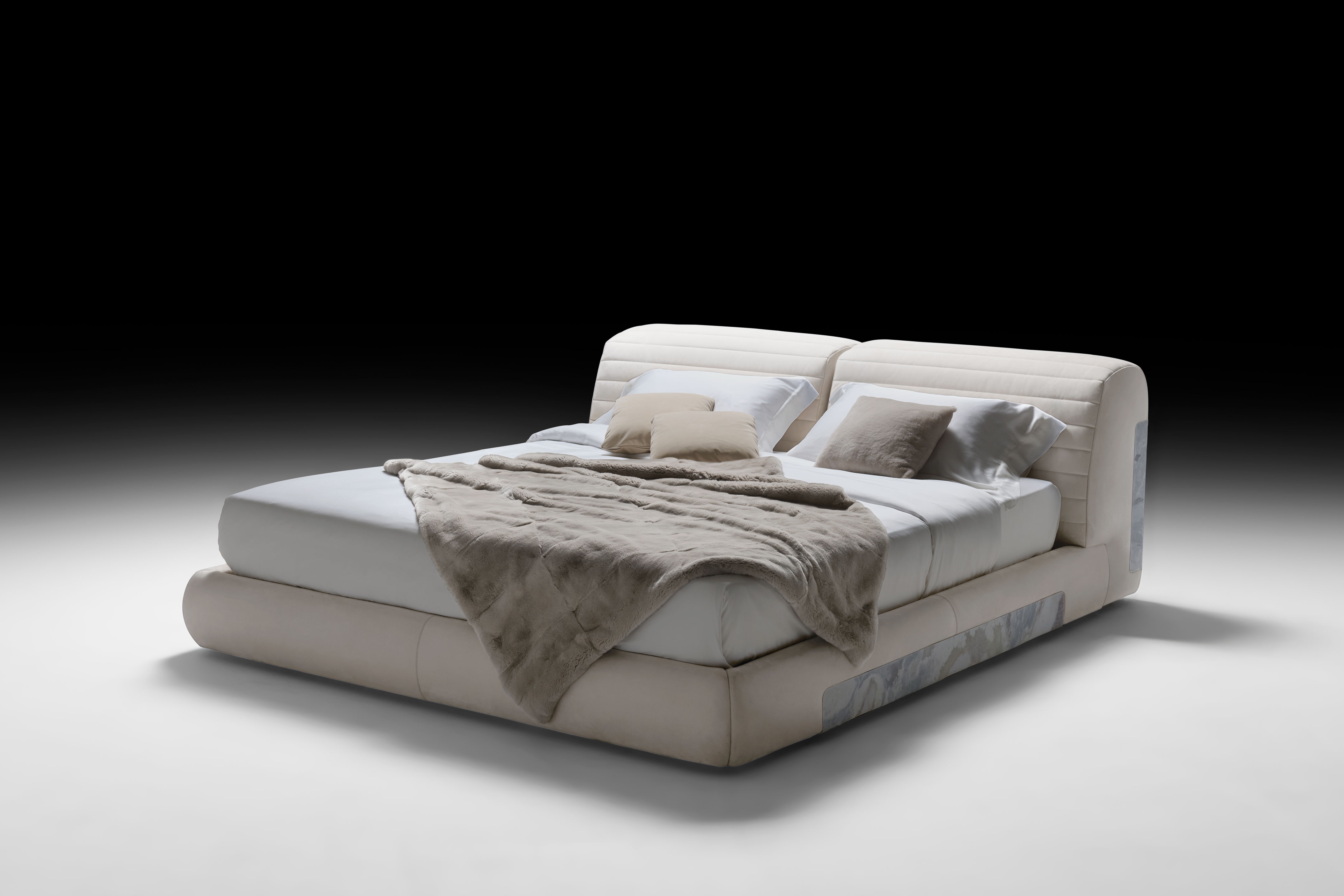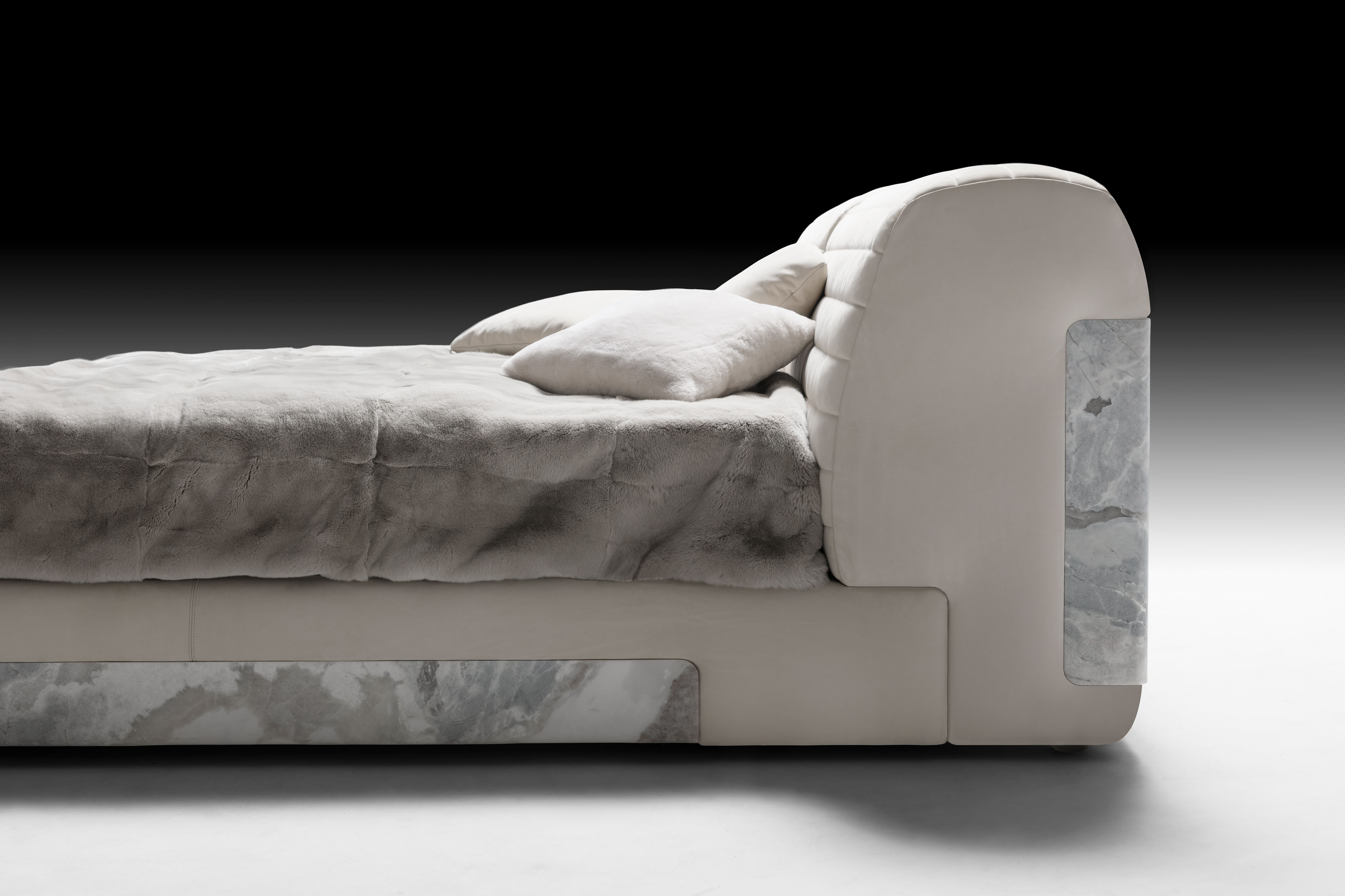 Traditionally constructed, the box spring provides comfort and favors an experience of total surrender. Slender marble surfaces surround and define the contours, shell-like protective, creating an elegant and decisive border. A meeting of evocative contrast between marble and leather, age old materials full of history. Eternal and noble, the marble embraces the subtlety and warmth of the leather.
