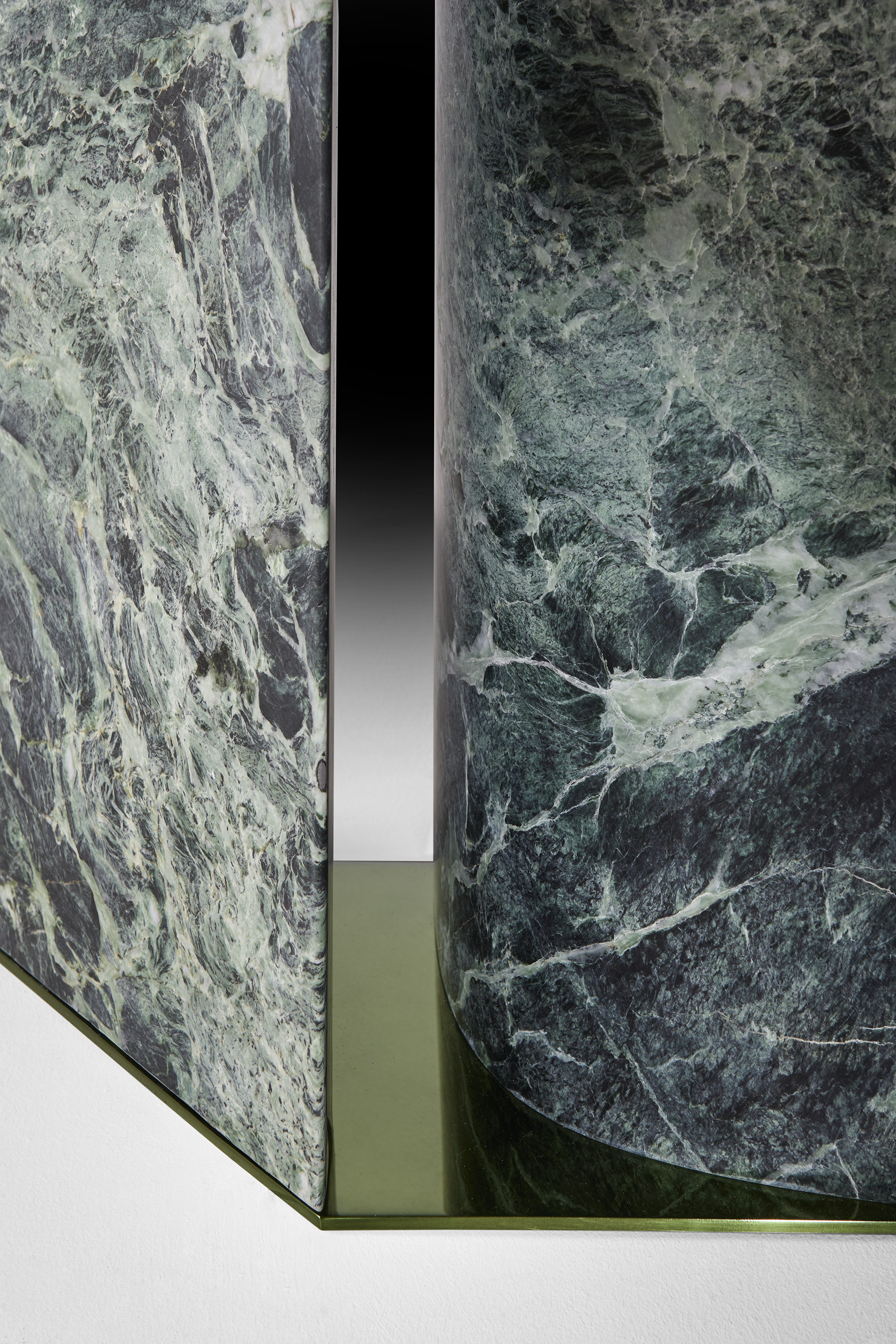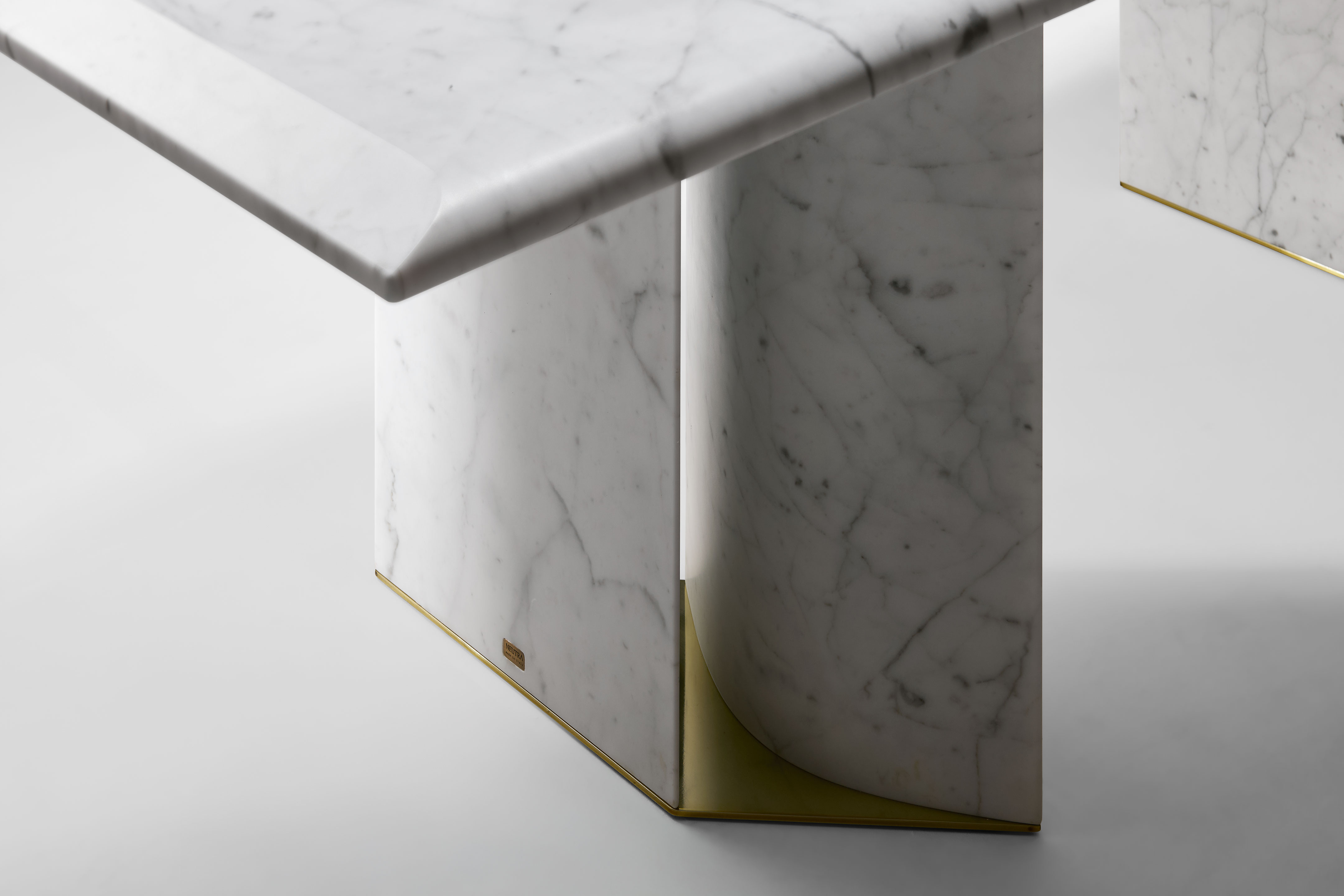 This architectural gap, minimal yet profound, accentuates the material presence of the marble, revealing new nuances with every change of perspective. Refined metal inlays at the base and meticulously crafted finishes speak to an obsessive attention to detail.