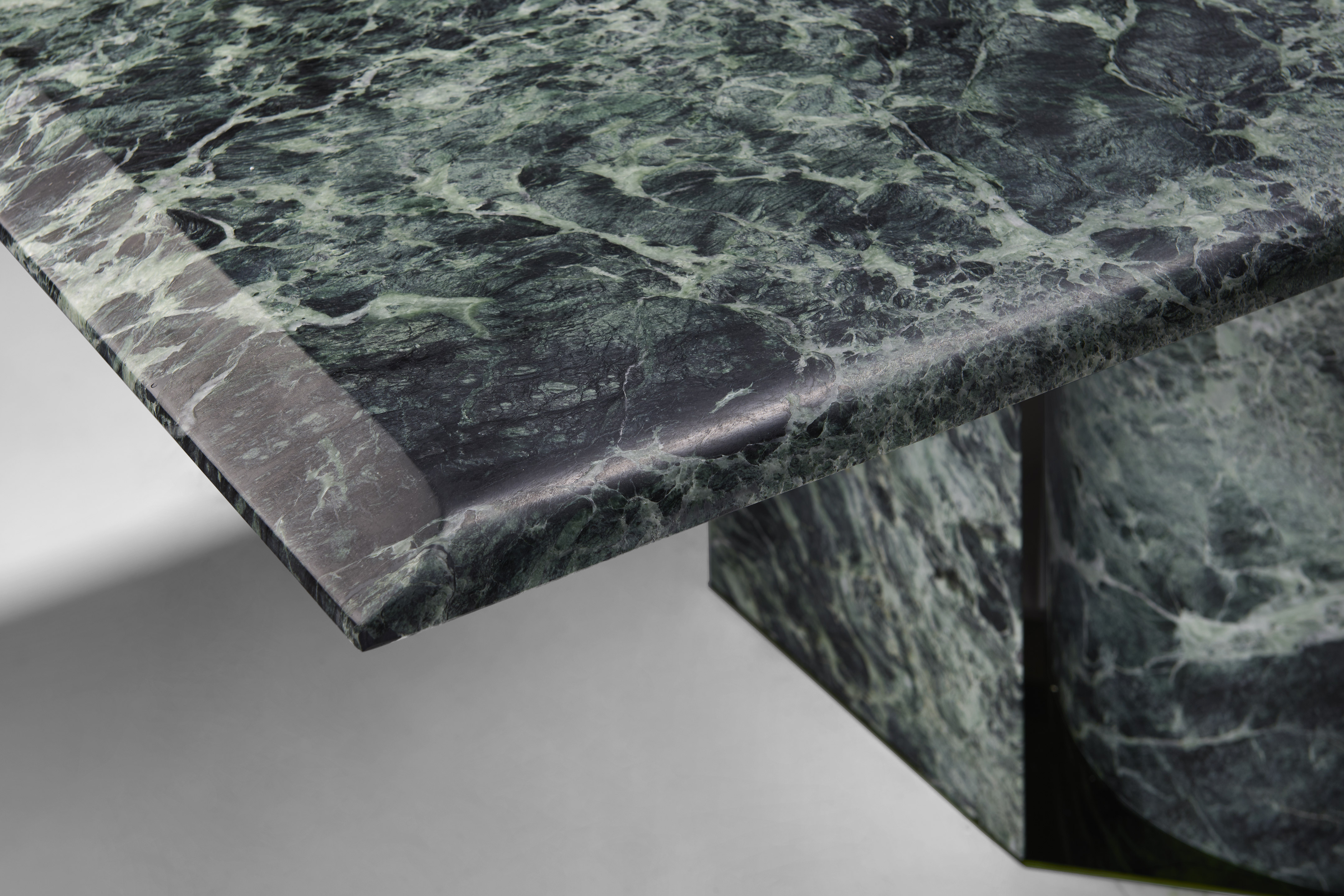 The same design sensibility is echoed in the tabletop, where contrasting linearities converge — soft curves and subtle inclinations along the edges. The smooth, polished surface flows seamlessly into the sculptural base, elevating both the tactile richness of the material and the precision of artisanal craftsmanship.