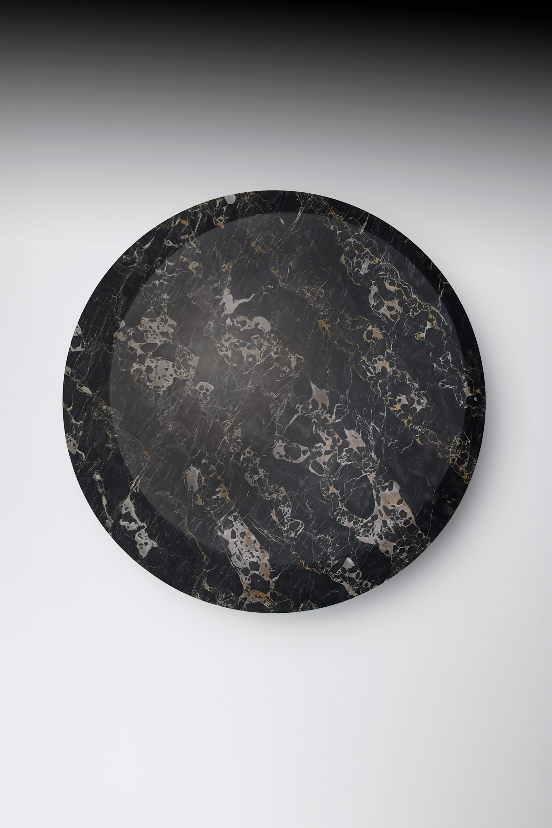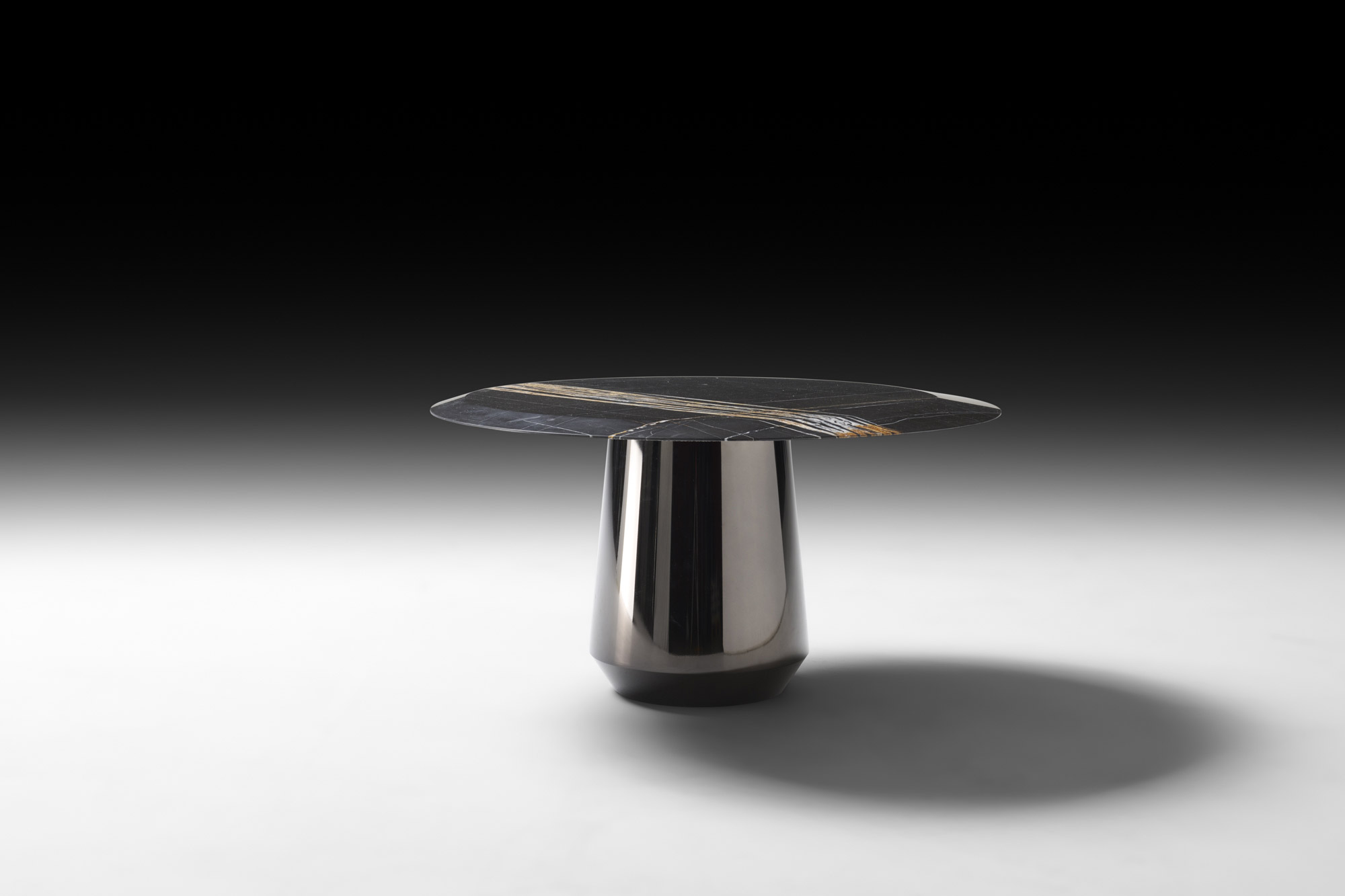 The asymmetry of the edge is no accident: it arises from the intersection of two concentric but dissimilar circles, carefully studied by Migliore+Servetto to impart a dynamic motion to the element. A dynamic concept echoed and emphasized in the base, a conical shape culminating in a cylinder. Tabletop and base create a play of forces, a visual tension between mass and lightness, between pure and opposing volumes.