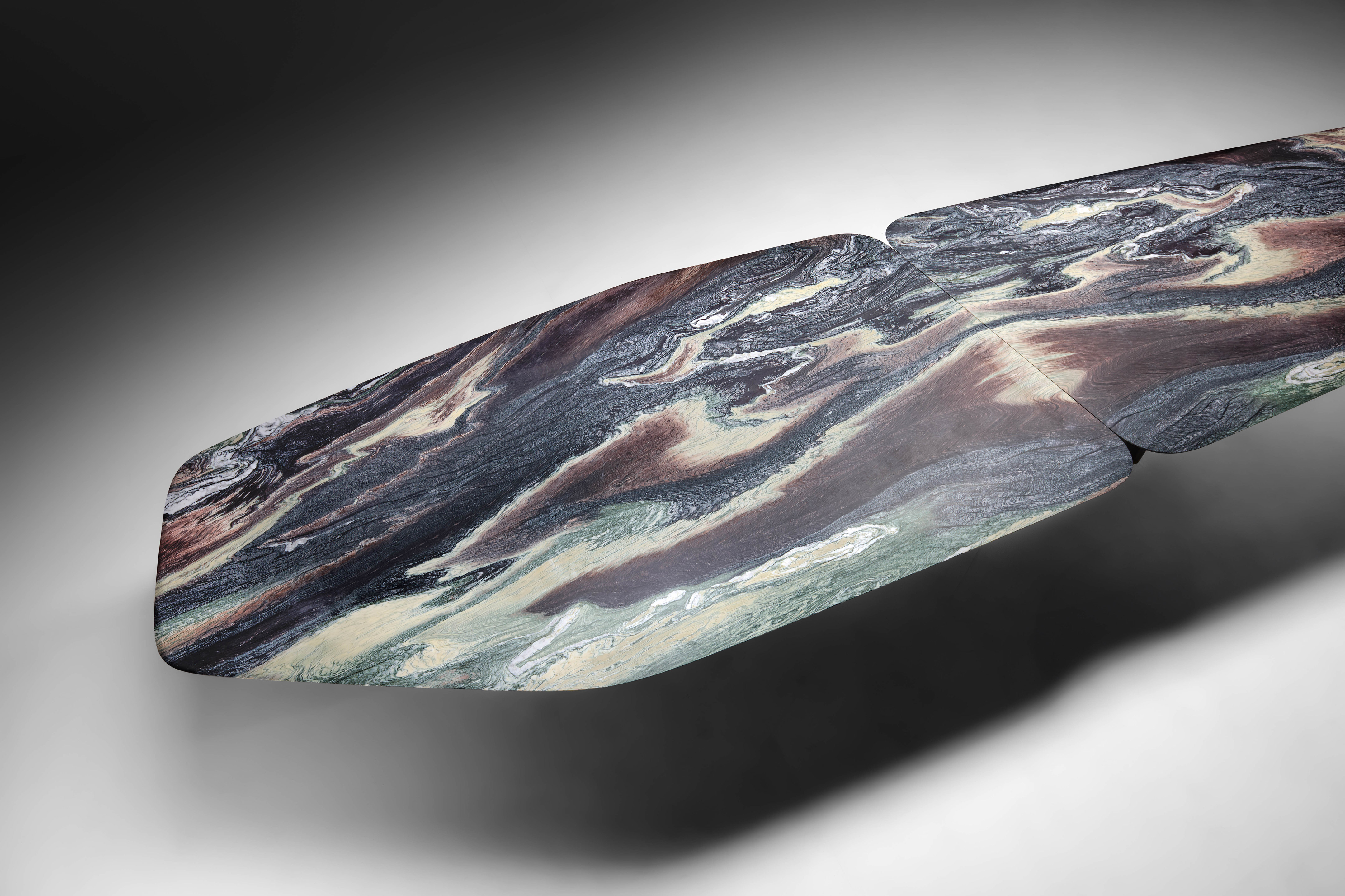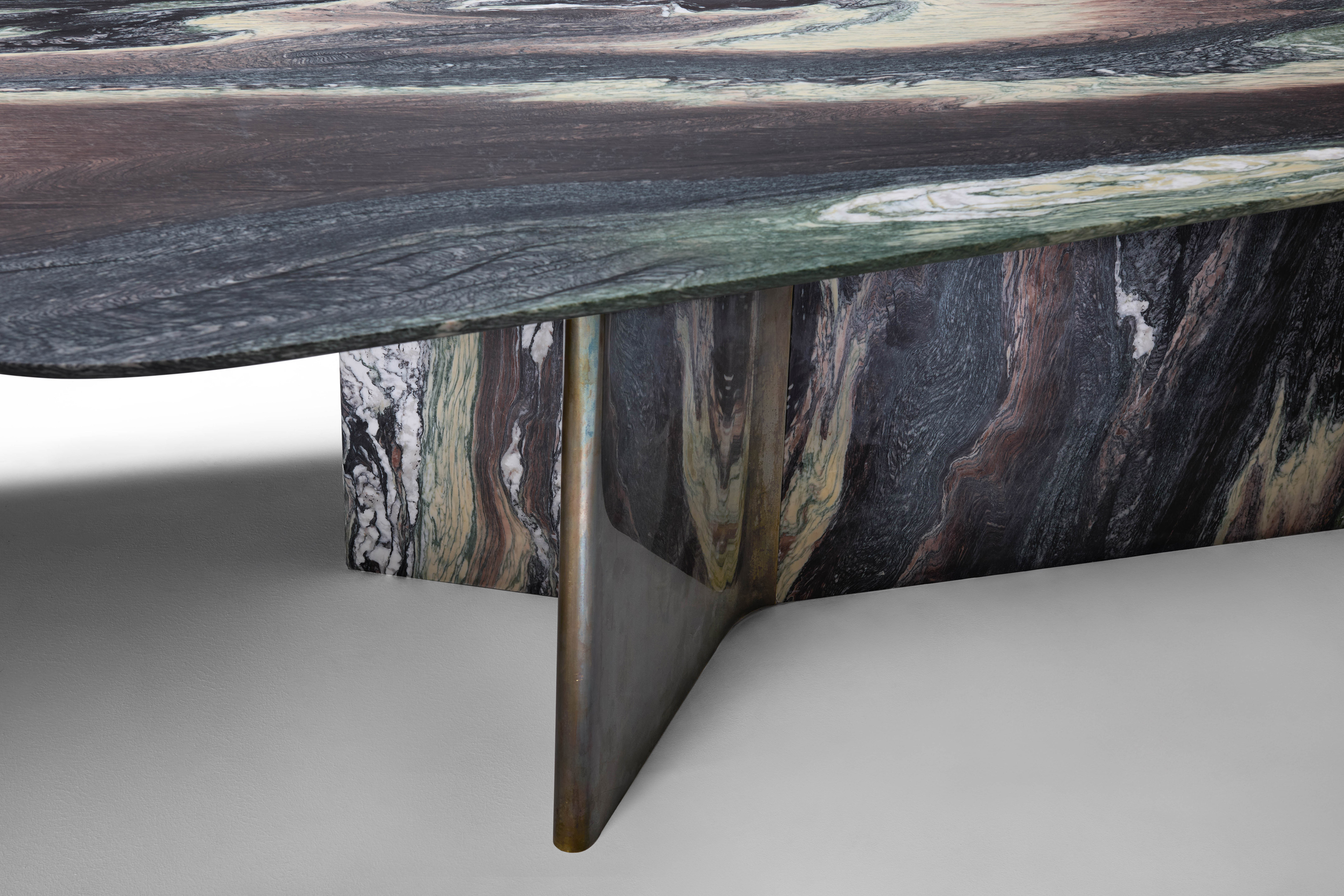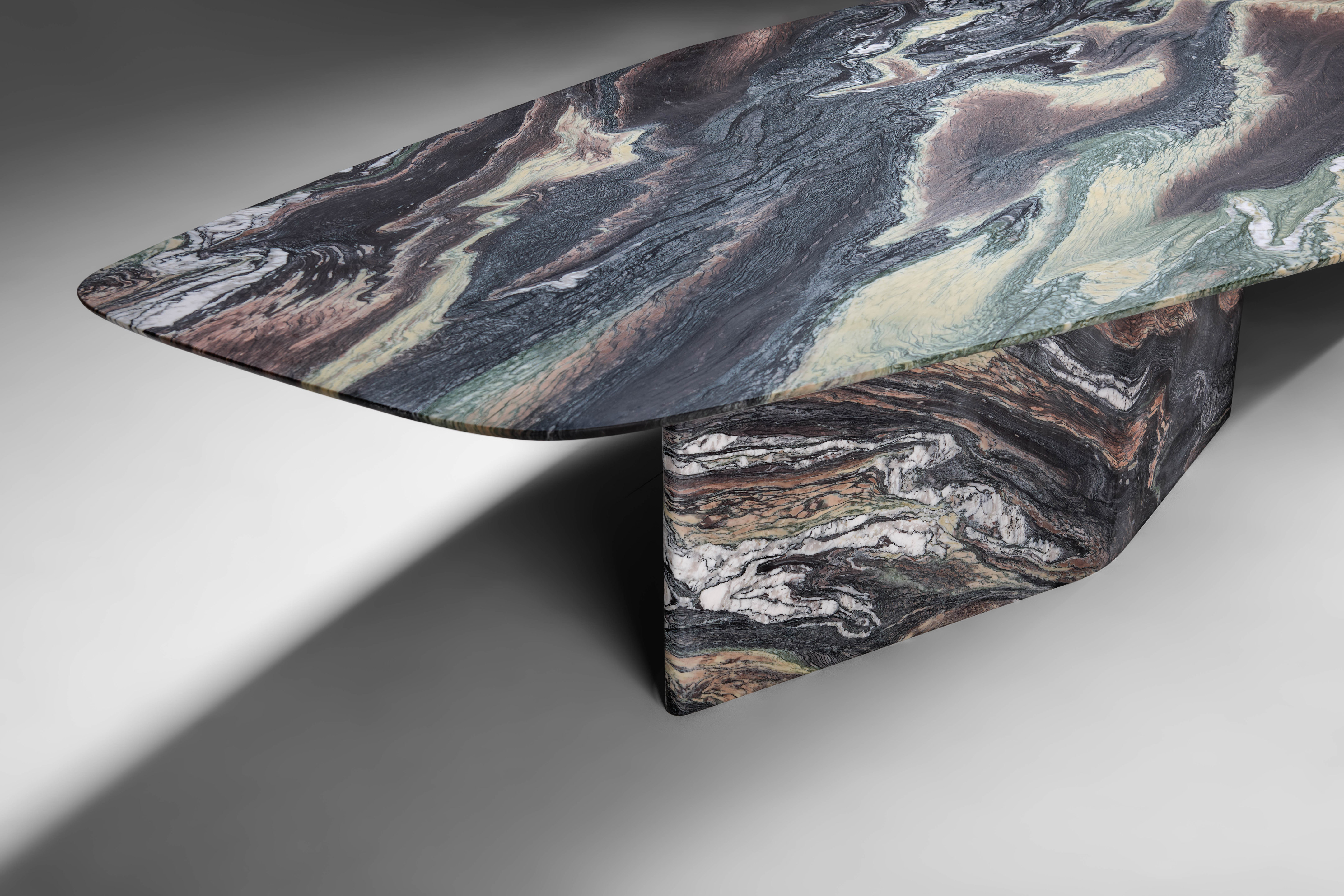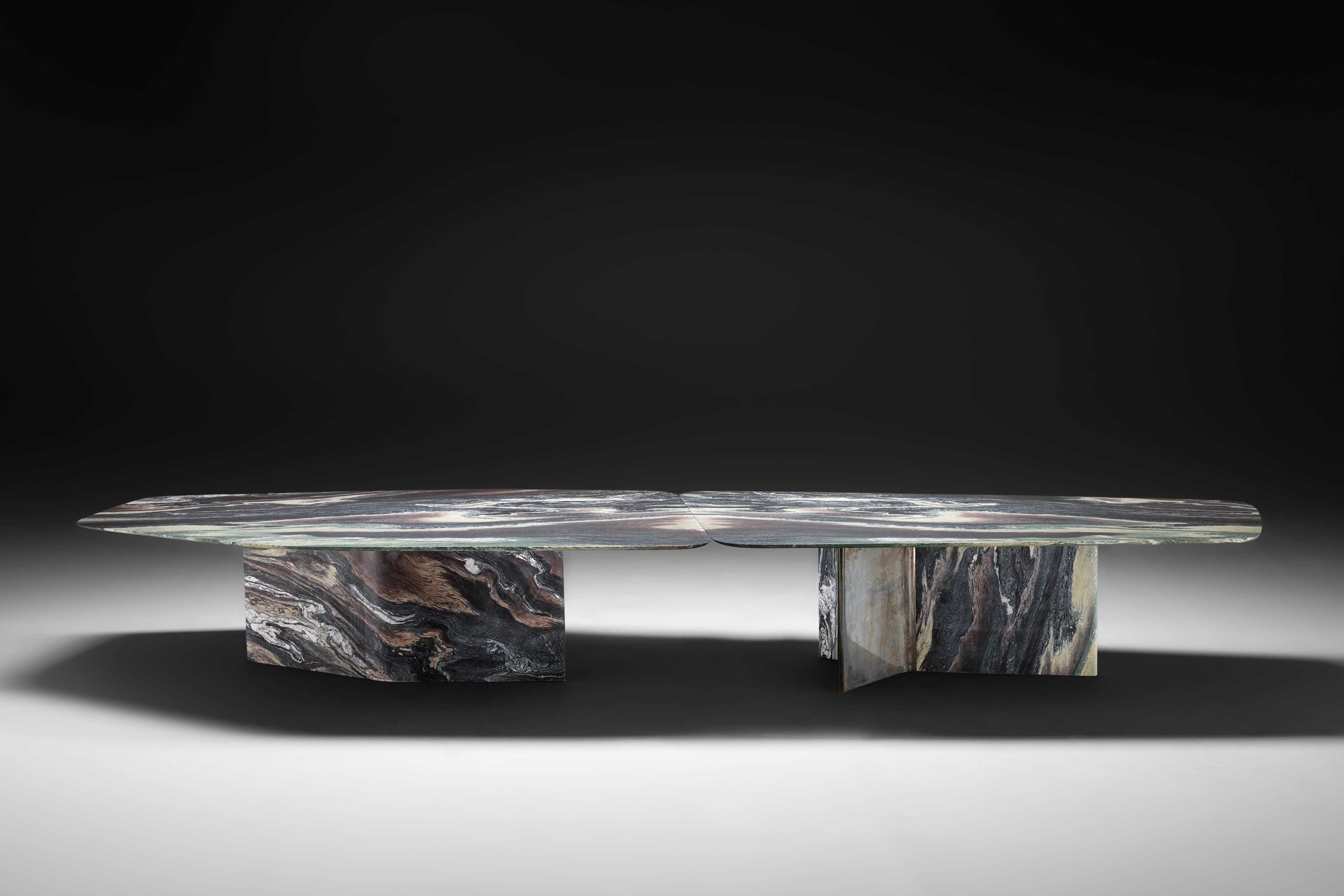 The Islas table is the result of a deep exploration — a meditation on form, material, and function that culminates in a richly layered visual and tactile experience. It is a celebration of contrasts: the strength and sensitivity of stone, the cool precision of metal, the dialogue between permanence and transformation.