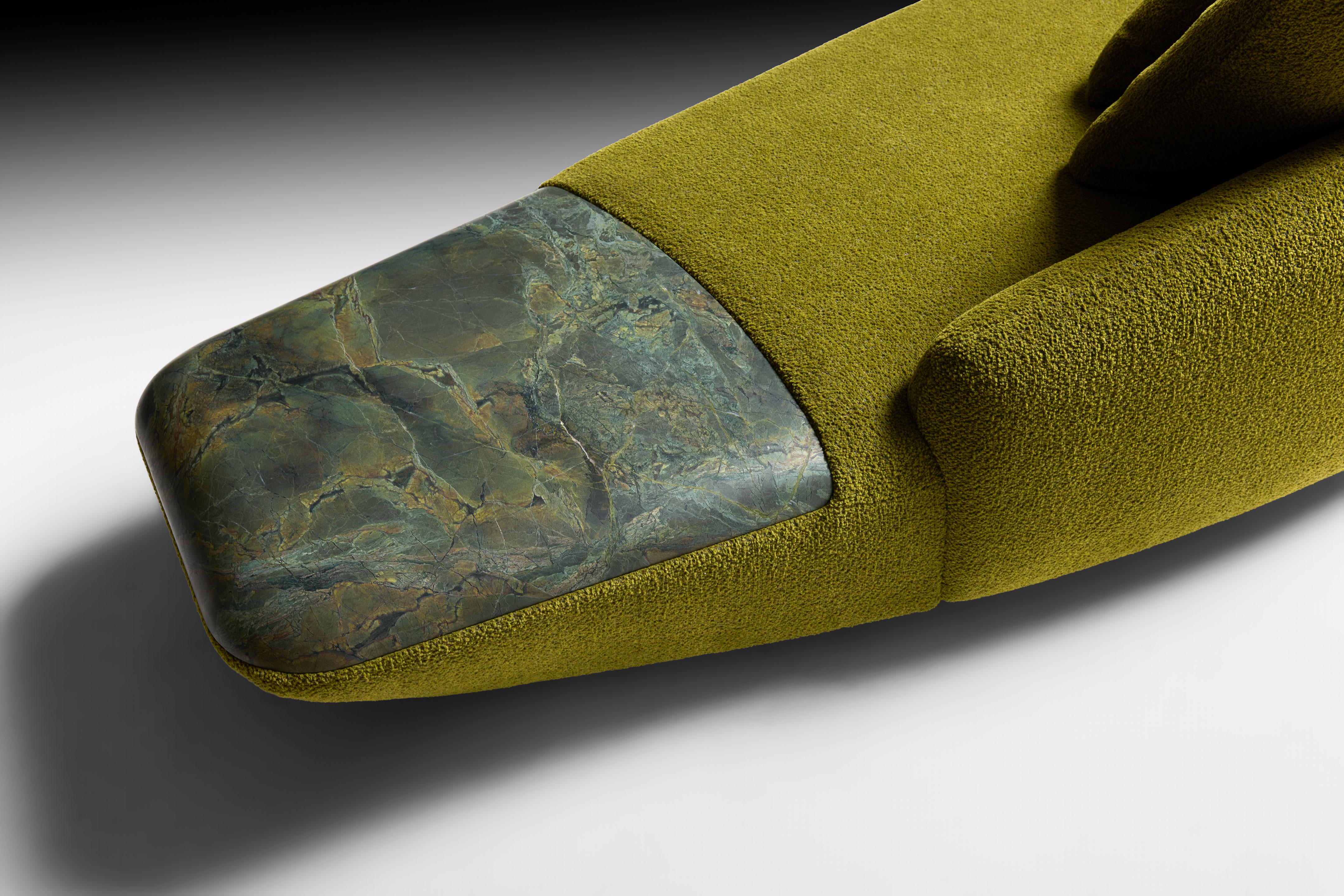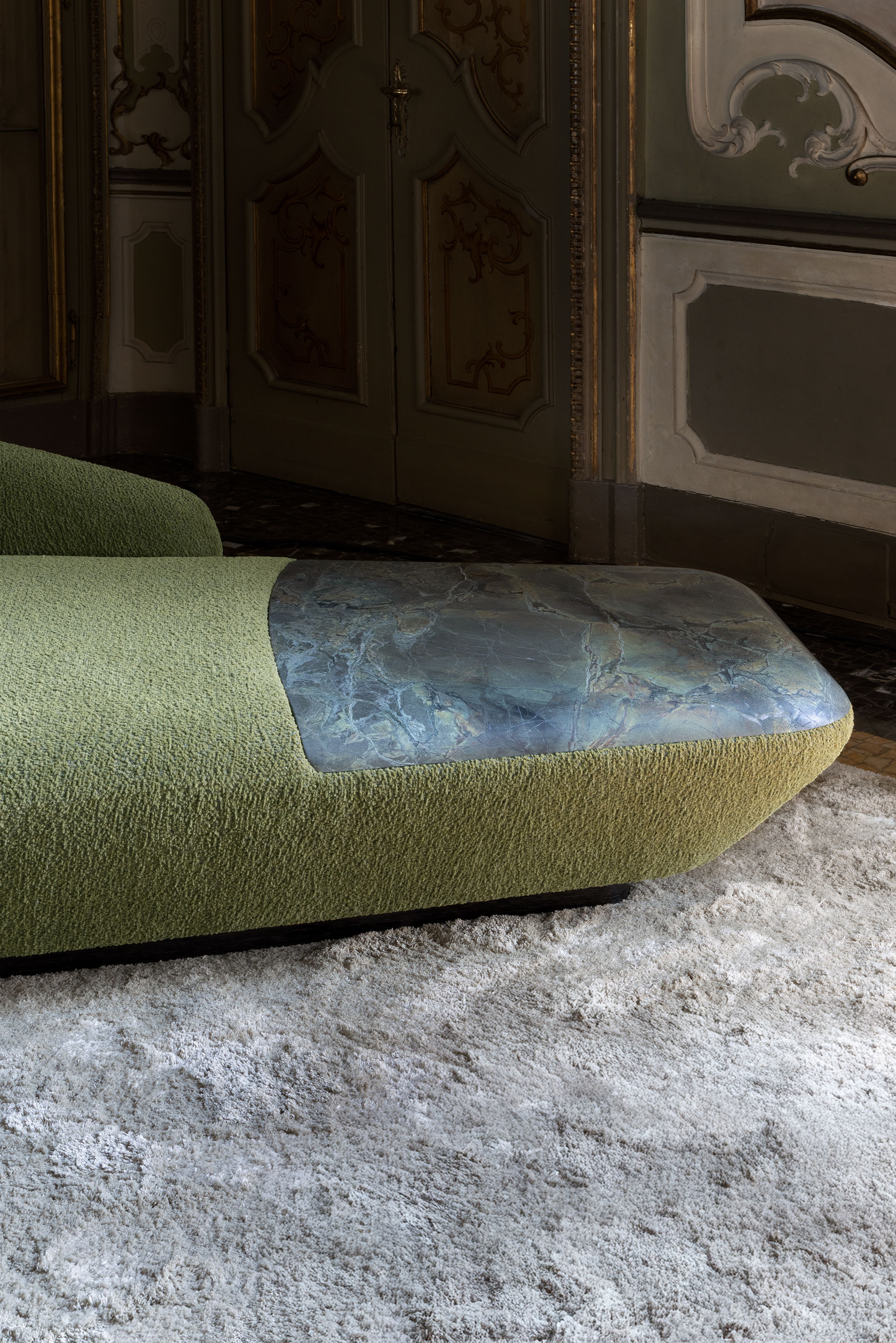 The same logic inspires the marble surface, which can be integrated into the chaise longue, transforming it into an autonomous island where elegance, relaxation, and versatility coexist.