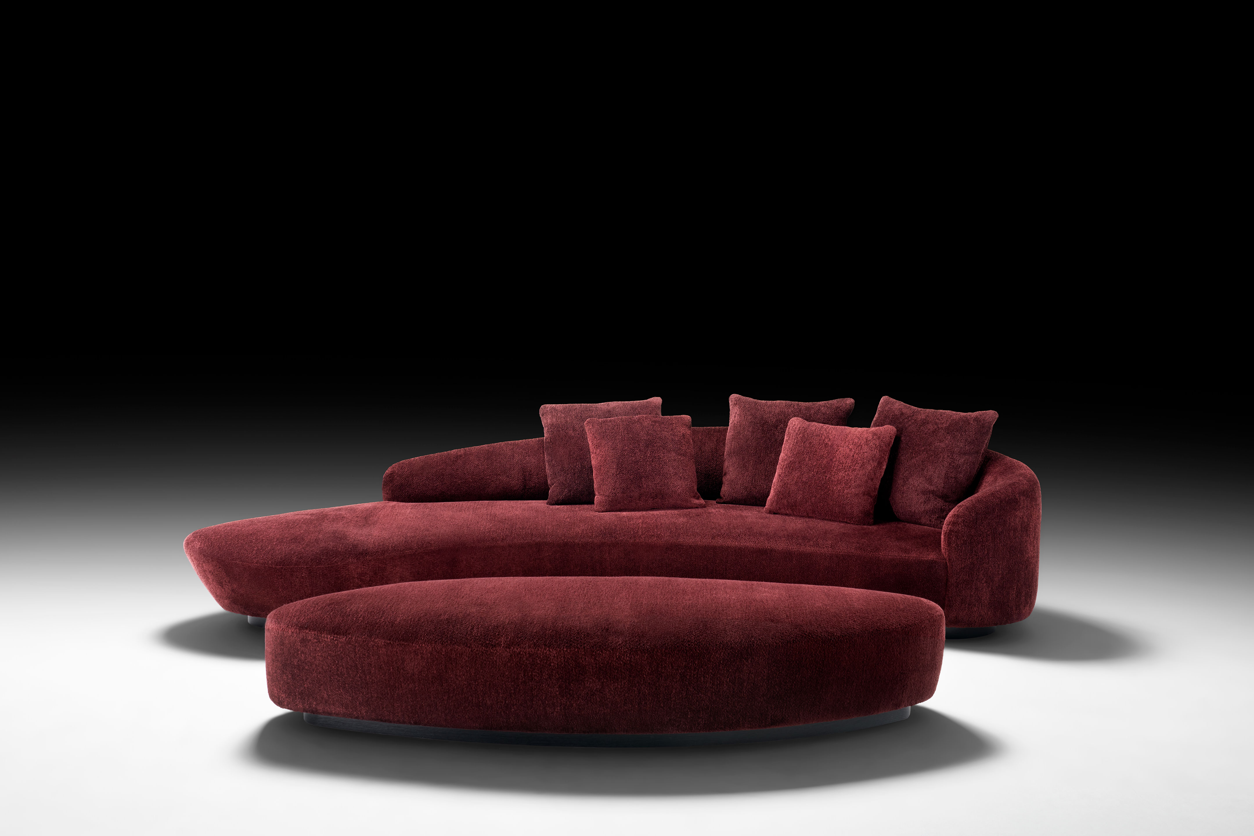 The poufs, available in various sizes, sit naturally alongside, completing the system with functionality and lightness. No mere accessories but dynamic presences that adapt to life’s necessities: extra seating, resting spots, extensions of comfort.