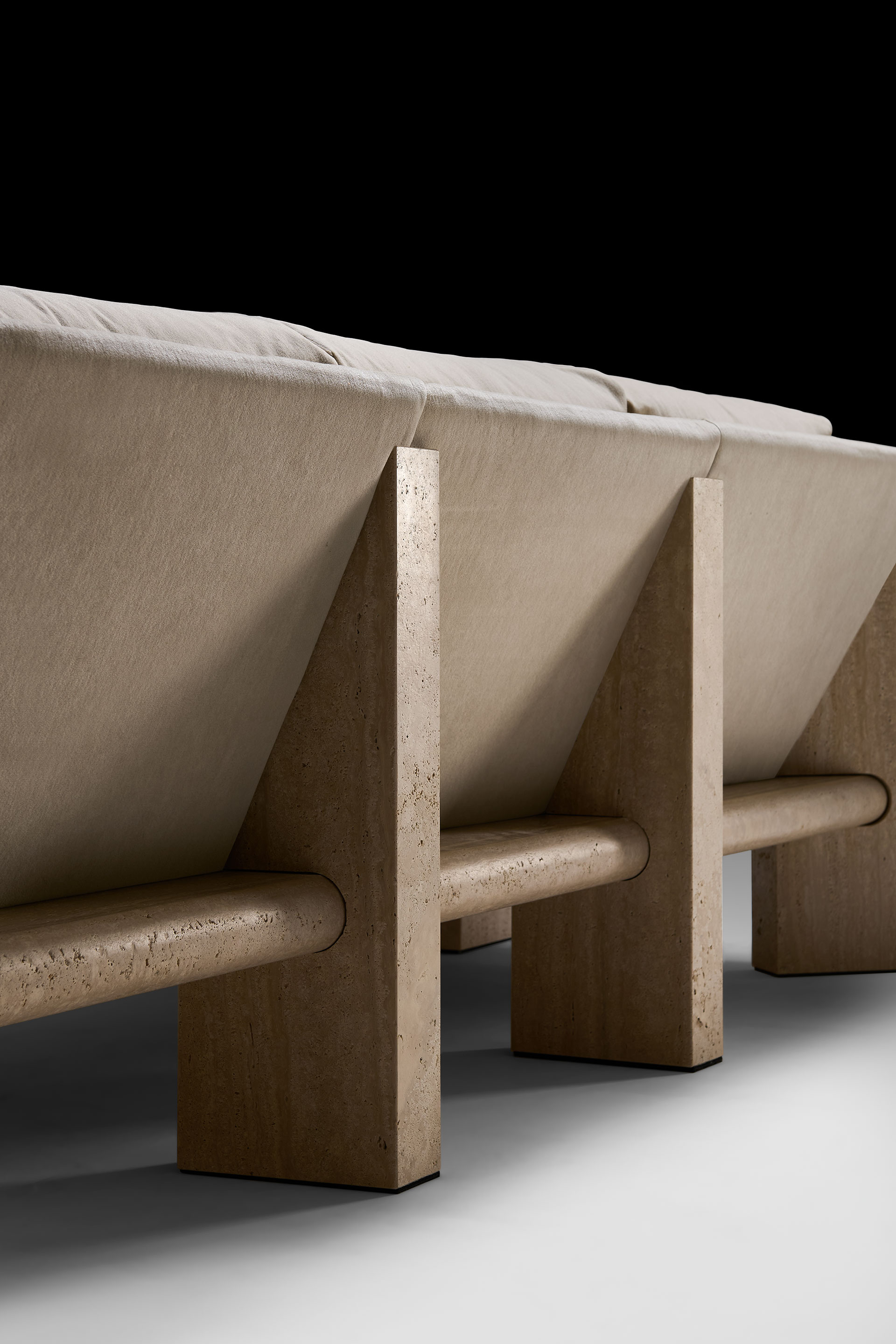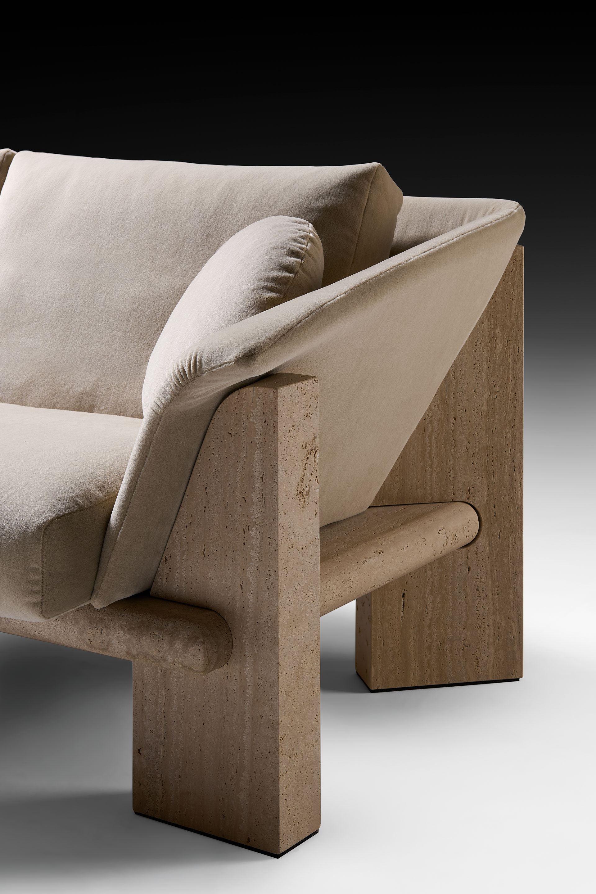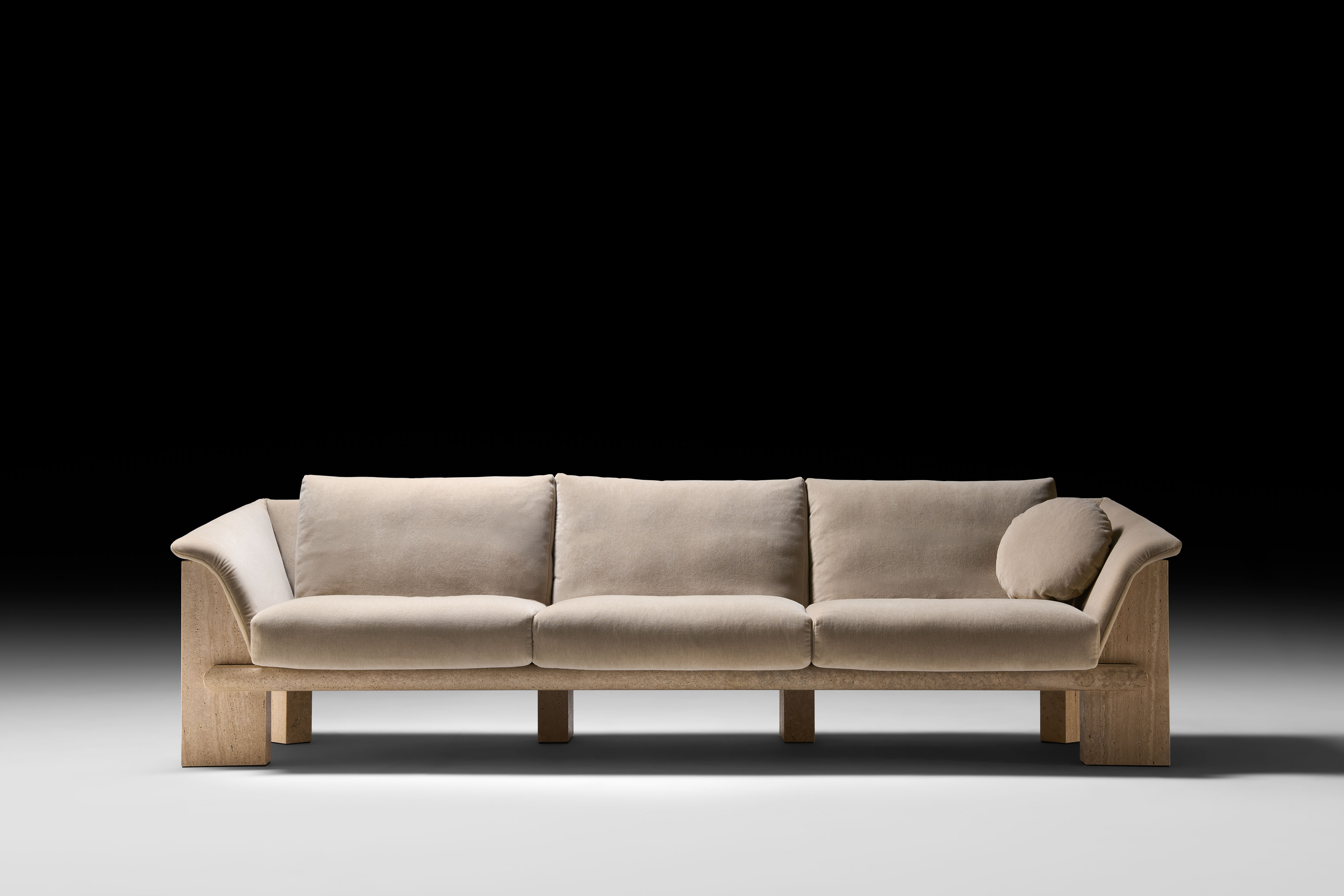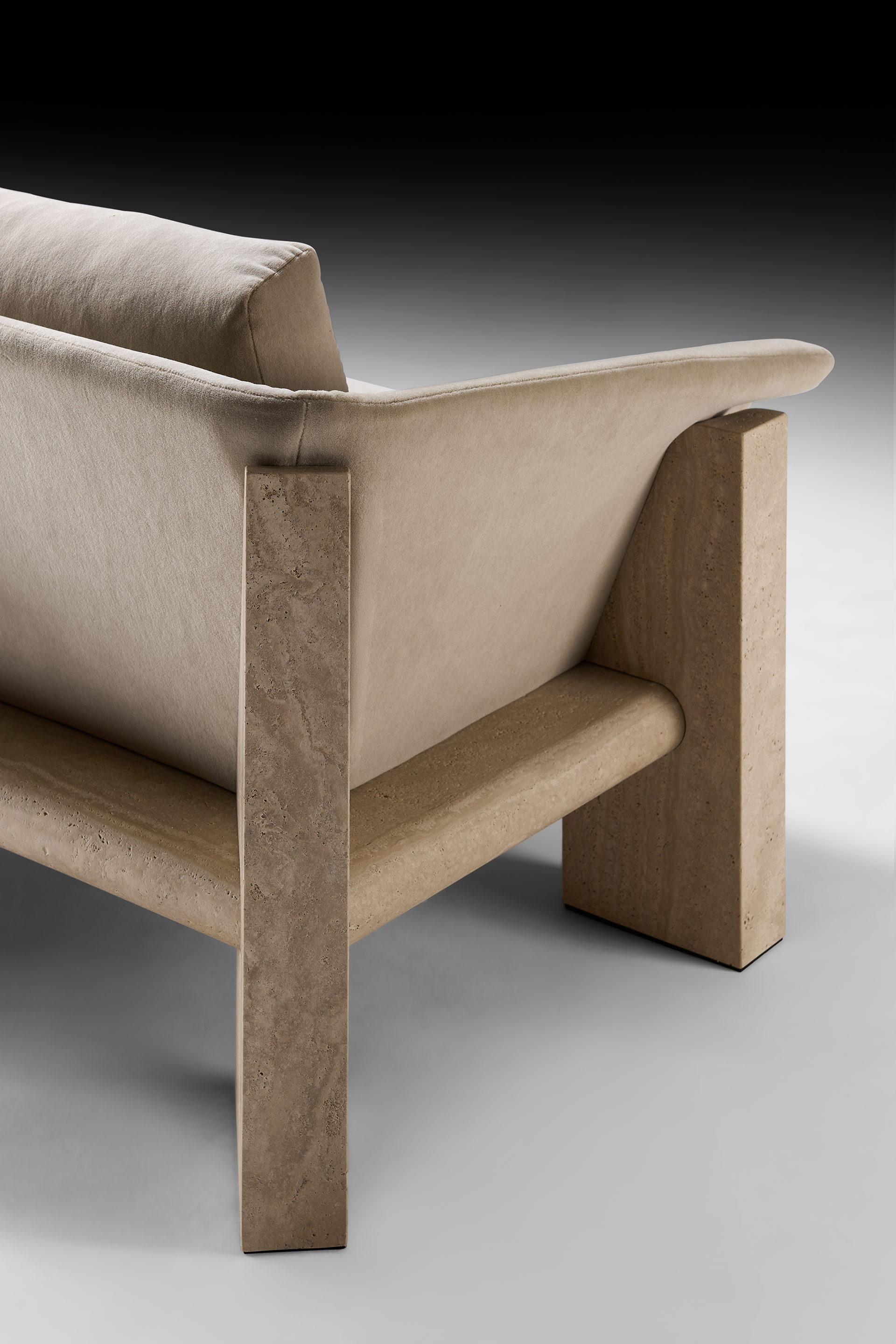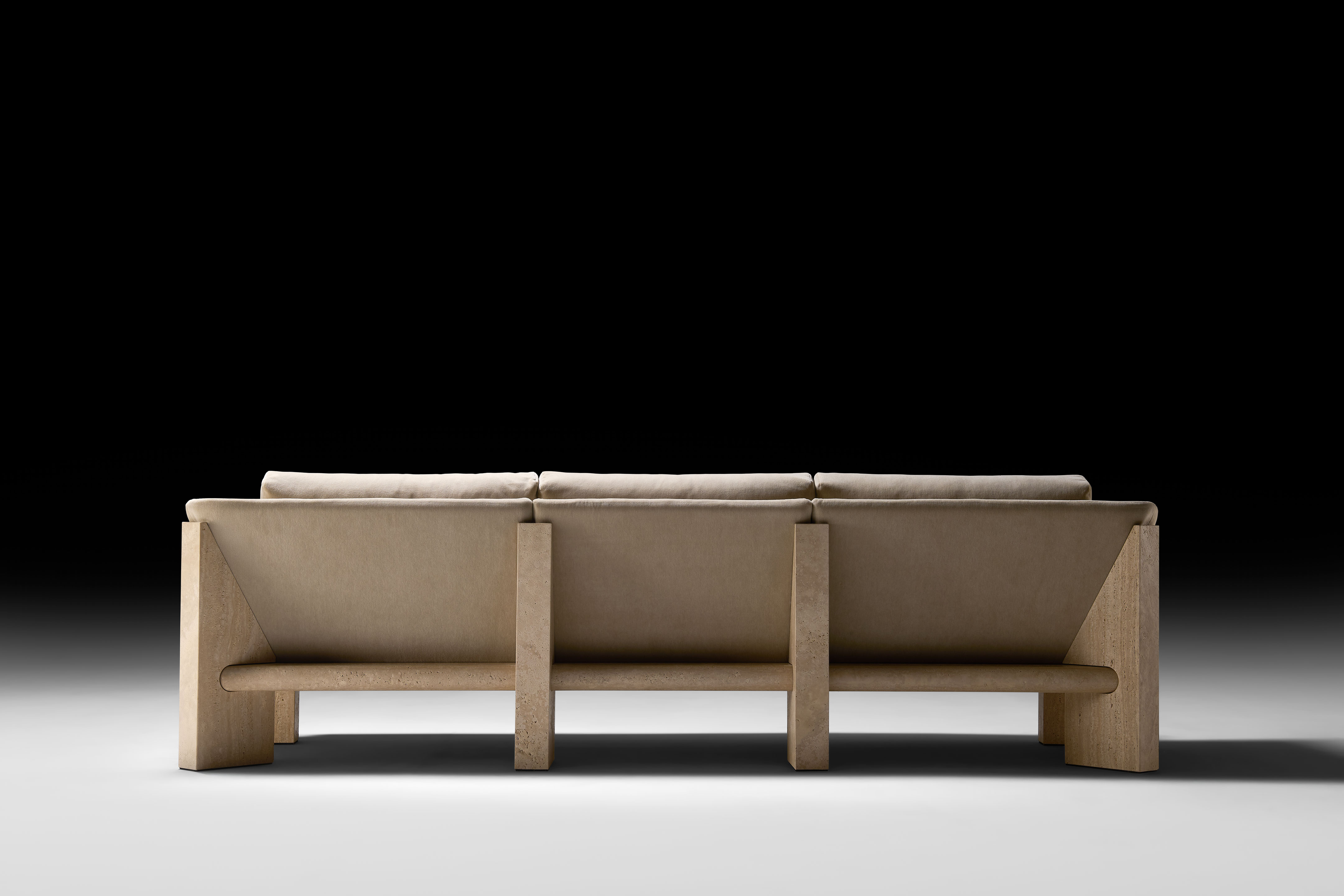 The sofa—available in two- and three-seater versions—is sculpted from marble: monumental and timeless. Soft, inviting volumes are seamlessly integrated into its structure, resulting in a contemporary expression of living design.
