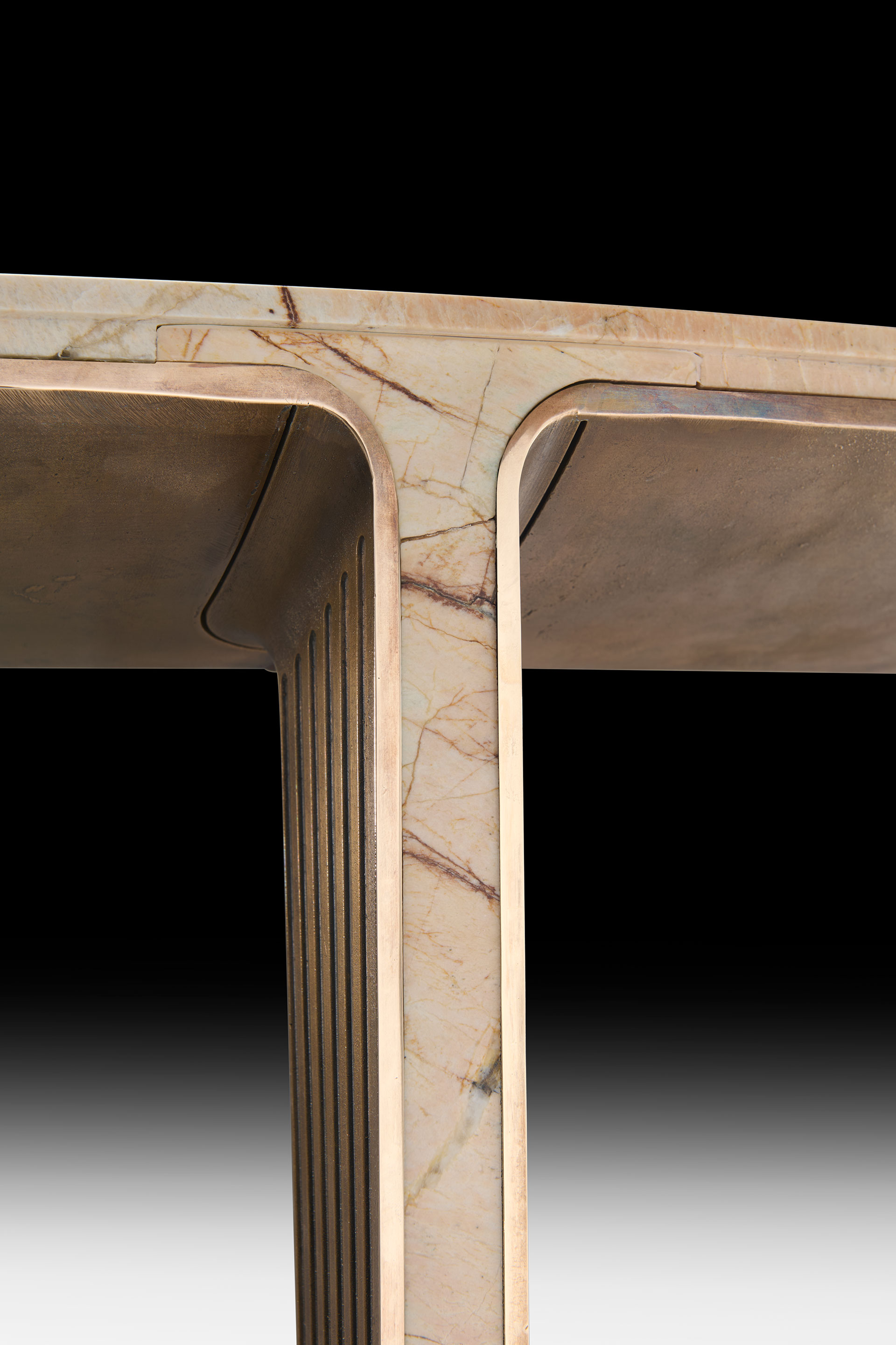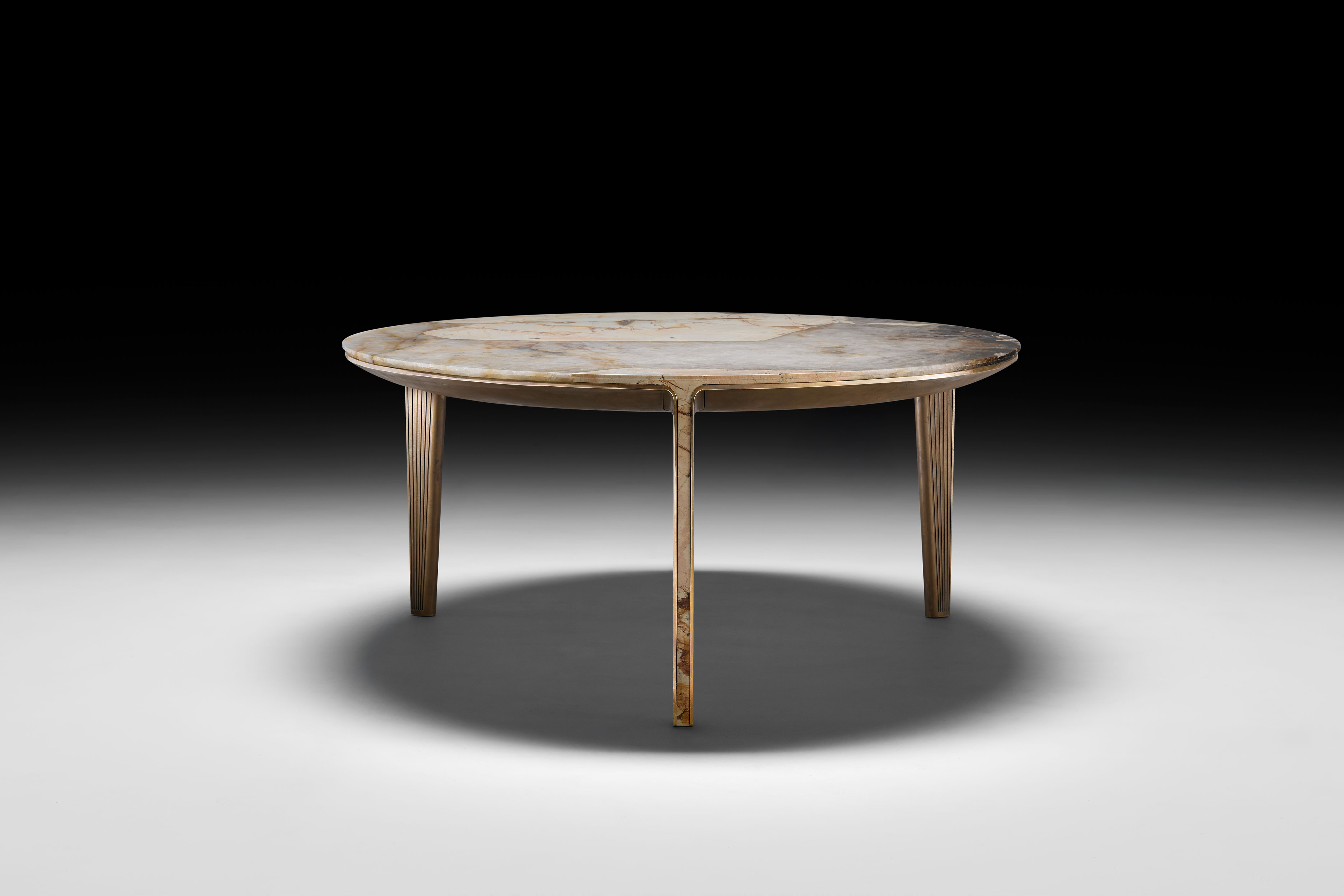 This sense of sacredness is reflected in the table’s elegant contours. The circular top, a symbol of cosmic harmony, merges with a sculptural bronze base, from which the legs extend in a fluid, measured gesture.